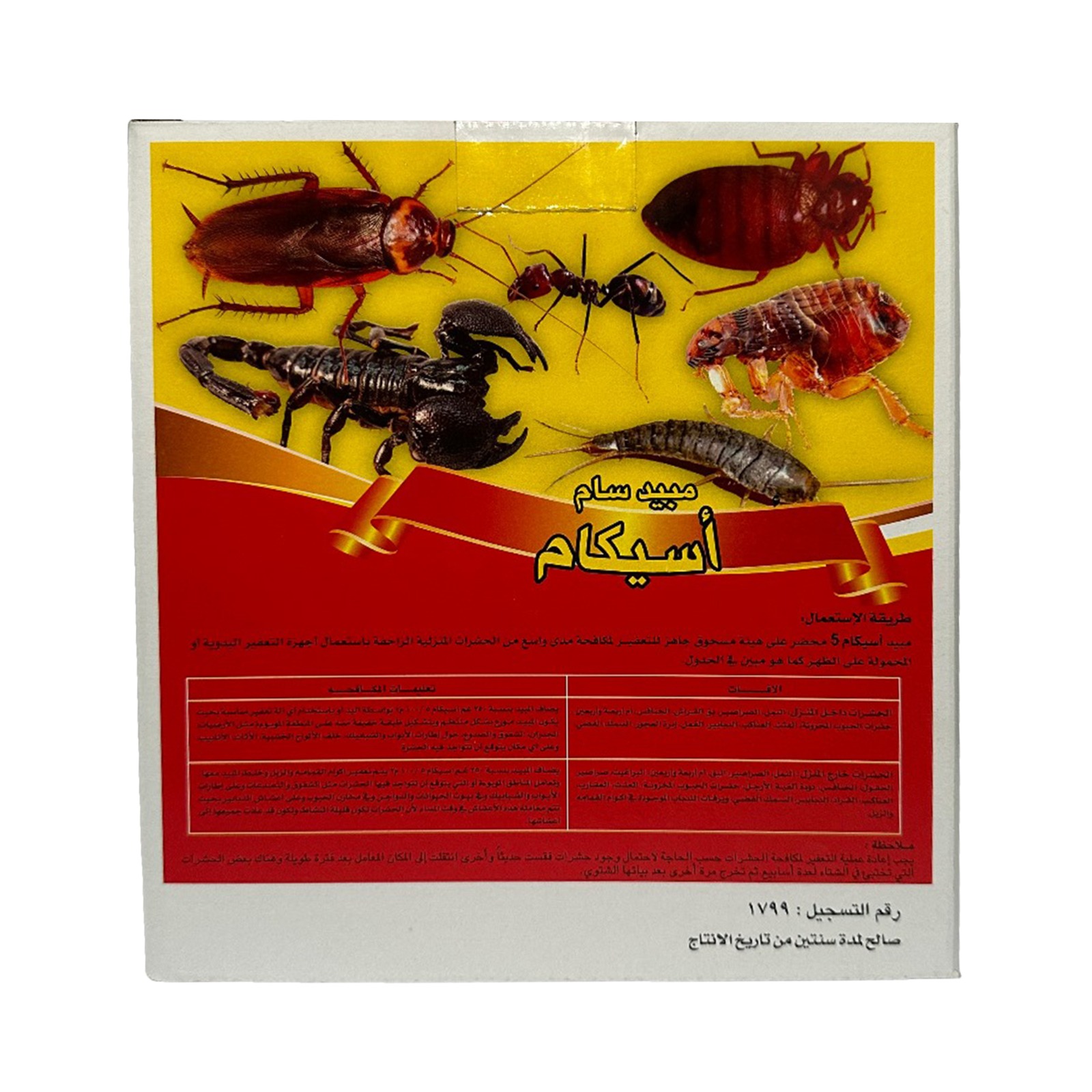 Add pesticide 250 g Acicm 5D /100m2, Mixing or fogging heaps of garbage and manure with pesticide. And treat the affected areas or that are expected to exist pests , such as cracks and around windows and doors in the homes of animals, poultry and grain stores and on the nests of wasps so that the treatment of these nests in the evening time because the insects have little activity and have all returned to their nests |